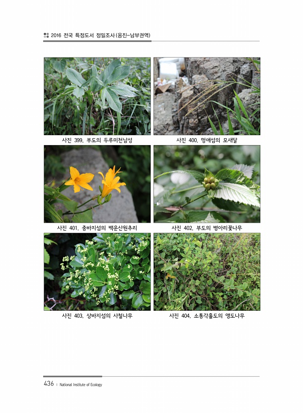 2016 전국 특정도서 정밀조사 옹진-남부권역 436 ? National Institute of Ecology 사진 399. 부도의 두루미천남성 사진 400. 멍애섬의 모새달 사진 401. 중바지섬의 백운산원추리 사진 402. 부도의 병아리꽃나무 사진 403. 상바지섬의 사철나무 사진 404. 소통각흘도의앵도나무