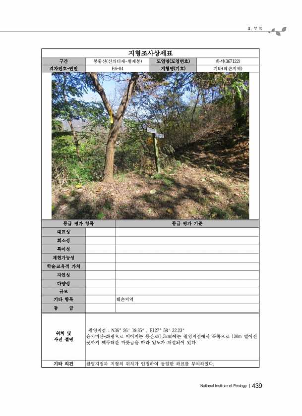 Ⅲ. 부 록 National Institute of EcologyⅠ439 지형조사상세표 구간 봉황산 신의터재-형제봉 도엽명 도엽번호 화서 367122 격자번호-연번 E6-04 지형명 기호 기타 훼손지역 등급 평가 항목 등급 평가 기준 대표성 희소성 특이성 재현가능성 학술?교육적 가치 자연성 다양성 규모 기타 항목 훼손지역 등 급 위치 및 사진 설명 촬영지점 N36° 26′ 19.85″ , E127° 58′ 32.23″ 윤지미산-화령으로 이어지는 등산로 1.5km 에는 촬영지점에서 북쪽으로 130m 떨어진 곳까지 백두대간 마룻금을 따라 임도가 개설되어 있다. 기타 의견 촬영지점과 지형의 위치가 인접하여 동일한 좌표를부여하였다.