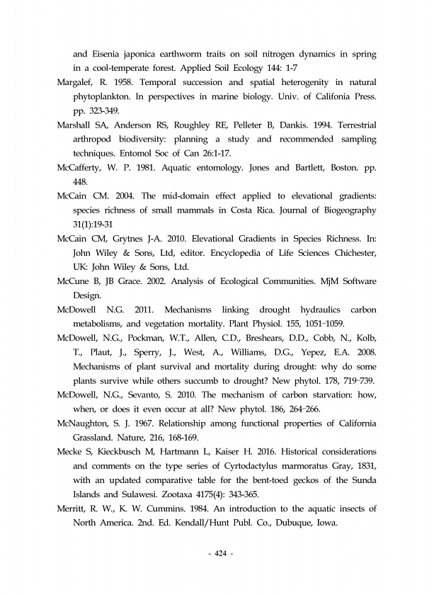 424 and Eisenia japonica earthworm traits on soil nitrogen dynamics in spring in a cool-temperate forest. Applied Soil Ecology 1441-7 Margalef, R. 1958. Temporal succession and spatial heterogenity in natural phytoplankton. In perspectives in marine biology. Univ. of Califonia Press. pp. 323-349. Marshall SA, Anderson RS, Roughley RE, Pelleter B, Dankis. 1994. Terrestrial arthropod biodiversitypla...