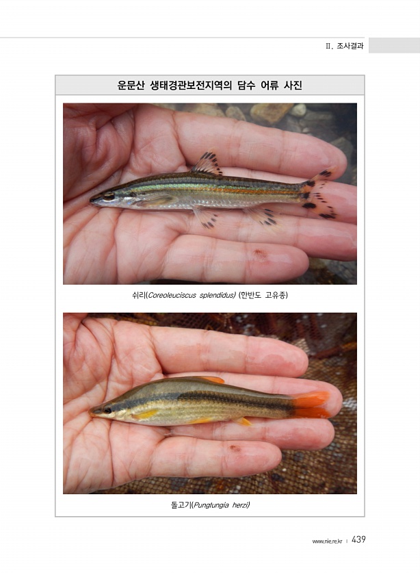 Ⅱ. 조사결과 www.nie.re.kr ? 439 운문산 생태경관보전지역의 담수 어류 사진 쉬리 Coreoleuciscus splendidus 한반도 고유종 돌고기 Pungtungia herzi