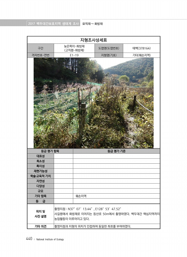 2017 백두대간보호지역 생태계 조사 묘적재 화방재 440 ? National Institute of Ecology 지형조사상세표 구간 늦은목이화방재 고직령-화방재 도엽명 도엽번호 태백 378164 격자번호-연번 E1-19 지형명 기호 기타 훼손지역 등급 평가 항목 등급 평가 기준 대표성 희소성 특이성 재현가능성 학술?교육적 가치 자연성 다양성 규모 기타 항목 훼손지역 등 급 위치 및 사진 설명 촬영지점 N37°07′13.44″, E128°53′47.52″ 사길령에서 화방재로 이어지는 등산로 50m에서 촬영하였다. 백두대간 핵심지역까지 농업활동이 이루어지고 있다. 기타 의견 촬영지점과 지형의 위치가 인접하여 동일한 좌표를부여하였다.