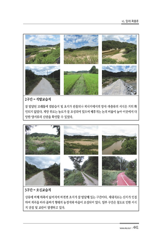 vi. 양서·파충류 www.nie.re.kr ?441 2구간 ? 석탑교습지 잘 발달된 모래톱에 범람습지 및 초지가 관찰되나 제내지에서의 양서·파충류의 서식은 거의 확 인되지 않았다. 제방 위로는 농로가 잘 조성되어 있으며 배후지는 논의 비율이 높아 이곳에서 다 양한 양서류의 산란을 확인할 수 있었다. 3구간 ? 오신교습지 상류에 비해 하폭이 넓어지며 하천변 초지가 잘 발달해 있는 구간이다. 제내지로는 산지가 인접 하여 계곡을 따라 골짜기 형태의 농경지와 마을이 조성되어 있다. 일부 구간은 철도로 인한 서식 지 단절 및 교란이 발생하고있다.