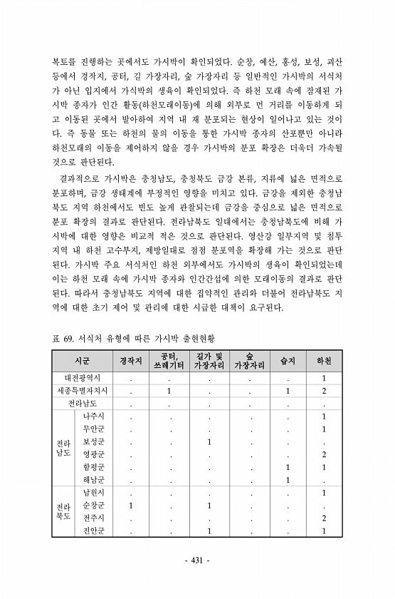 431 시군 경작지 공터, 쓰레기터 길가 및 가장자리 숲 가장자리 습지 하천 대전광역시 1 세종특별자치시 1 1 2 전라남도 전라 남도 나주시 1 무안군 1 보성군 1 영광군 2 함평군 1 1 해남군 1 전라 북도 남원시 1 순창군 1 1 전주시 2 진안군 1 1 표 69. 서식처 유형에 따른 가시박 출현현황 복토를 진행하는 곳에서도 가시박이 확인되었다. 순창, 예산, 홍성, 보성, 괴산 등에서 경작지, 공터, 길 가장자리, 숲 가장자리 등 일반적인 가시박의 서식처 가 아닌 입지에서 가식박의 생육이 확인되었다. 즉 하천 모래 속에 잠재된 가 시박 종자가 인간 활동 하천모래이동 에 의해 외부로 먼 거리를 이동하게 되 고 이동된 곳에서 발아하여 지역 내 재 분포되는 현상이 일어나고 있는 것이 다. 즉 동물 또는...