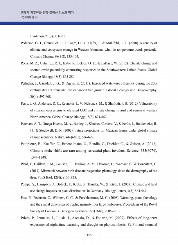 448 생태계 기후변화 영향·취약성·리스크 평가 -연구사례 분석- Evolution, 21 3 , 111-113. Pederson, G. T., Graumlich, L. J., Fagre, D. B., Kipfer, T., & Muhlfeld, C. C. 2010 A century of climate and ecosystem change in Western Montanawhat do temperature trends portend?. Climatic Change, 98 1-2 , 133-154. Peery, M. Z., Guti?rrez, R. J., Kirby, R., LeDee, O. E., & LaHaye, W. 2012 Climate change and spotted owlspotentially co...