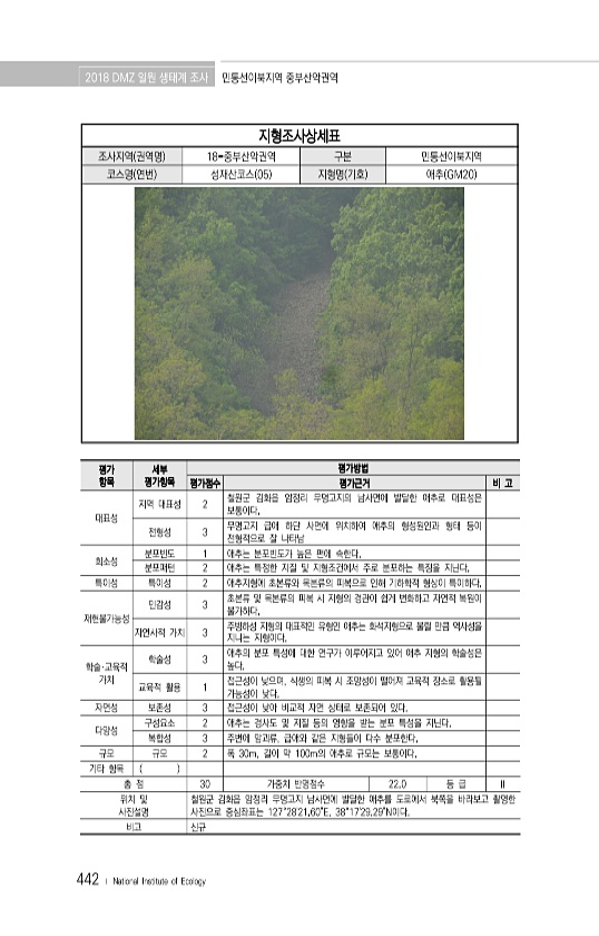 2018 DMZ 일원 생태계 조사 민통선이북지역 중부산악권역 442 ? National Institute of Ecology 지형조사상세표 조사지역 권역명 18-중부산악권역 구분 민통선이북지역 코스명 연번 성재산코스 05 지형명 기호 애추 GM20 평가 항목 세부 평가항목 평가방법 평가점수 평가근거 비 고 대표성 지역 대표성 2 철원군 김화읍 암정리 무명고지의 남사면에 발달한 애추로 대표성은 보통이다. 전형성 3 무명고지 급애 하단 사면에 위치하여 애추의 형성원인과 형태 등이 전형적으로 잘 나타남 희소성 분포빈도 1 애추는 분포빈도가 높은 편에 속한다. 분포패턴 2 애추는 특정한 지질 및 지형조건에서 주로 분포하는 특징을 지닌다. 특이성 특이성 2 애추지형에 초본류와 목본류의 피복으로 인해 기하학적 형상이 ...