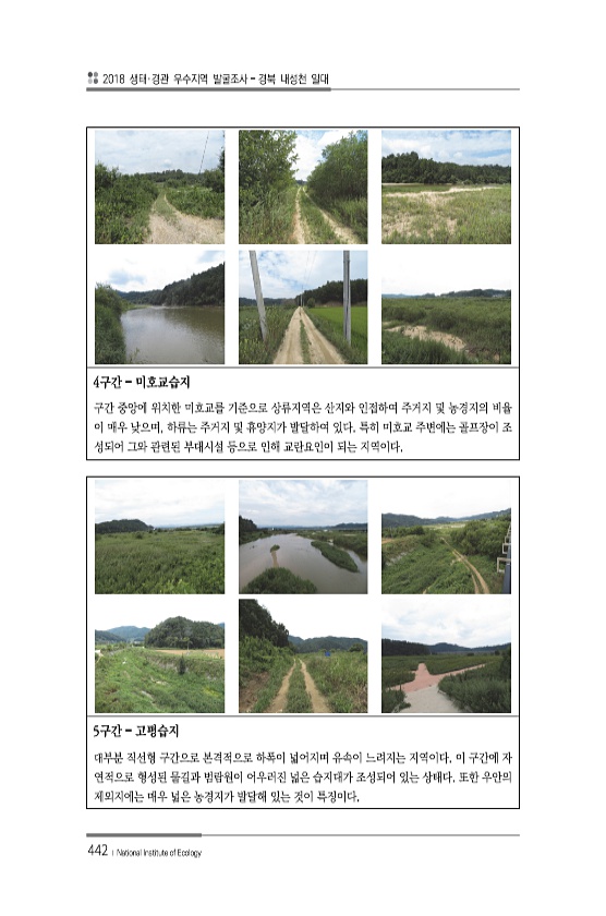 2018 생태·경관 우수지역 발굴조사 경북 내성천 일대 442 ? National Institute of Ecology 4구간 ? 미호교습지 구간 중앙에 위치한 미호교를 기준으로 상류지역은 산지와 인접하여 주거지 및 농경지의 비율 이 매우 낮으며, 하류는 주거지 및 휴양지가 발달하여 있다. 특히 미호교 주변에는 골프장이 조 성되어 그와 관련된 부대시설 등으로 인해 교란요인이 되는 지역이다. 5구간 ? 고평습지 대부분 직선형 구간으로 본격적으로 하폭이 넓어지며 유속이 느려지는 지역이다. 이 구간에 자 연적으로 형성된 물길과 범람원이 어우러진 넓은 습지대가 조성되어 있는 상태다. 또한 우안의 제외지에는 매우 넓은 농경지가 발달해 있는 것이특징이다.