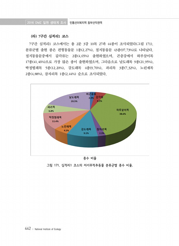 2016 DMZ 일원 생태계 조사 민통선이북지역 동부산악권역 442 ? National Institute of Ecology 라 7구간 심적리1 코스 7구간 심적리1 코스에서는 총 2문 3강 10목 27과 44종이 조사되었다 그림 171 분류군별 출현 종은 편형동물문 1종 2.27% , 절지동물문 43종 97.73% 로 나타났다. 절지동물문중에서 갑각류는 2종 4.65% 출현하였으며, 곤충강에서 하루살이목 17종 41.46% 으로 가장 많은 종이 출현하였으며, 그다음으로 날도래목 9종 21.95% , 딱정벌레목 5종 12.20% , 강도래목 4종 9.76% , 파리목 3종 7.32% , 노린재목 2종 4.88% , 잠자리목 1종 2.44% 순으로 조사되었다. 종수 비율 그림 171. 심적리1 코스의 저서무척...