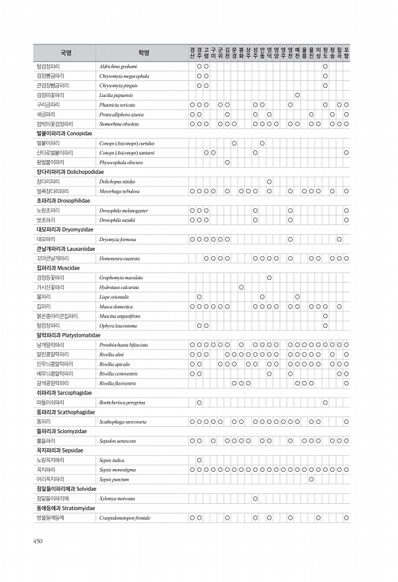 450 털검정파리 Aldrichina grahami ○ ○ ○ 검정뺨금파리 Chrysomyia megacephala ○ ○ ○ 큰검정뺨금파리 Chrysomyia pinguis ○ ○ ○ 검정띠꽃파리 Lucilia papuensis ○ 구리금파리 Phaenicia sericata ○ ○ ○ ○ ○ ○ ○ ○ ○ ○ ○ 새금파리 Protocalliphora azurea ○ ○ ○ ○ ○ ○ ○ ○ 점박이꽃검정파리 Stomorhina obsoleta ○ ○ ○ ○ ○ ○ ○ ○ ○ ○ ○ ○ ○ ○ ○ ○ ○ 벌붙이파리과 Conopidae 벌붙이파리 Conops Asiconops curtulus ○ ○ 산타로벌붙이파리 Conops Asiconops santaroi ○ ○ ○ ○ 왕벌붙이파리 Physocephala...
