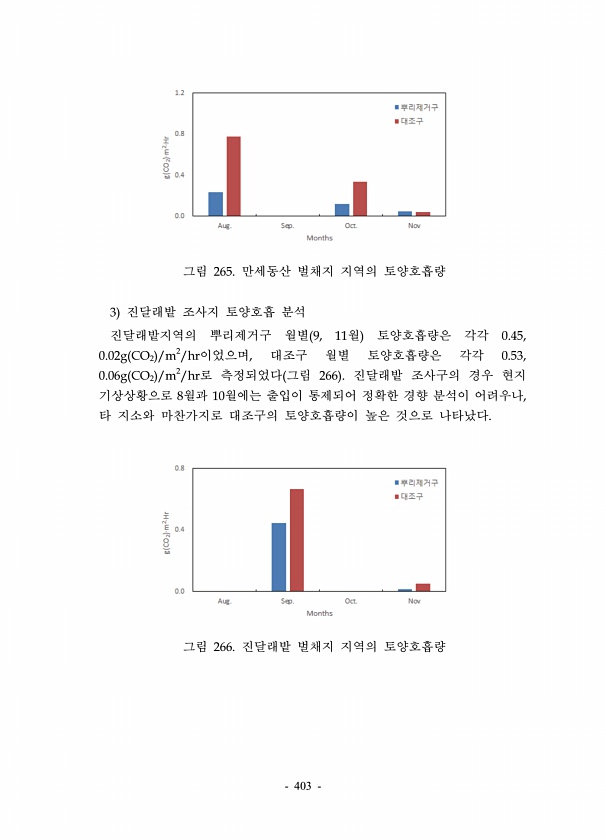403 그림 265. 만세동산 벌채지 지역의 토양호흡량 3 진달래밭 조사지 토양호흡 분석 진달래밭지역의 뿌리제거구 월별 9, 11월 토양호흡량은 각각 0.45, 0.02g CO2 /m2/hr이었으며, 대조구 월별 토양호흡량은 각각 0.53, 0.06g CO2 /m2/hr로 측정되었다 그림 266 진달래밭 조사구의 경우 현지 기상상황으로 8월과 10월에는 출입이 통제되어 정확한 경향 분석이 어려우나, 타 지소와 마찬가지로 대조구의 토양호흡량이 높은 것으로 나타났다. 그림 266. 진달래밭 벌채지 지역의토양호흡량