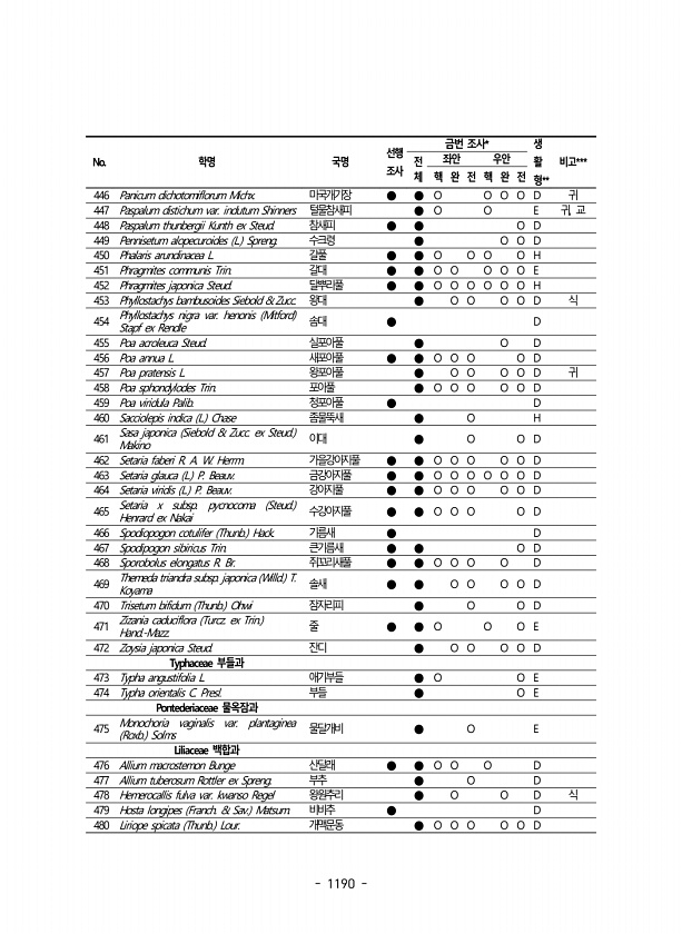 1190 No. 학명 국명 선행 조사 금번 조사* 생 활 형 ** 전 비고*** 체 좌안 우안 핵 완 전 핵 완 전 446 Panicum dichotomiflorum Michx. 미국개기장 ● ● O O O O D 귀 447 Paspalum distichum var. indutum Shinners 털물참새피 ● O O E 귀, 교 448 Paspalum thunbergii Kunth ex Steud. 참새피 ● ● O D 449 Pennisetum alopecuroides L. Spreng. 수크령 ● O O D 450 Phalaris arundinacea L. 갈풀 ● ● O O O O H 451 Phragmites communis Trin. 갈대 ● ● O O O O O E 452 Phragmites j...