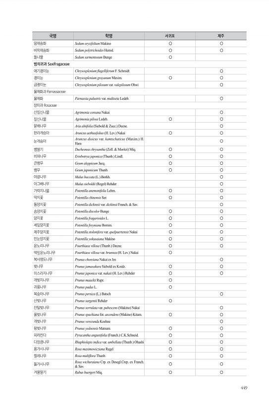 449 땅채송화 Sedum oryzifolium Makino ○ ○ 바위채송화 Sedum polytrichoides Hemsl. ○ ○ 돌나물 Sedum sarmentosum Bunge ○ 범의귀과 Saxifragaceae 애기괭이눈 Chrysosplenium fagelliferum F. Schmidt ○ 괭이눈 Chrysosplenium grayanum Maxim. ○ ○ 금괭이눈 Chrysosplenium pilosum var. valepilosum Ohwi ○ 물매화과 Parnassiaceae 물매화 Parnassia palustris var. multiseta Ledeb. ○ 장미과 Rosaceae 산짚신나물 Agrimonia coreana Nakai ○ 짚신나물 Agrimonia pilosa Led...