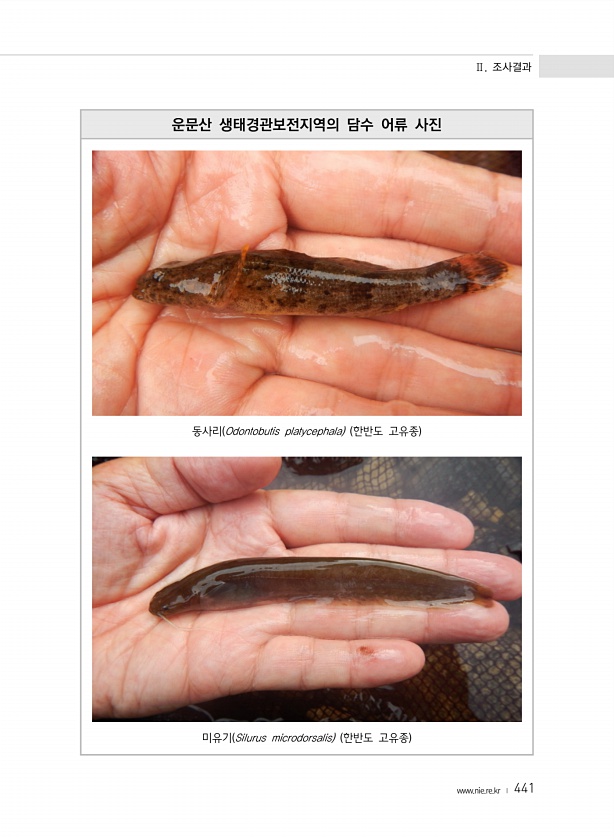 Ⅱ. 조사결과 www.nie.re.kr ? 441 운문산 생태경관보전지역의 담수 어류 사진 동사리 Odontobutis platycephala 한반도 고유종 미유기 Silurus microdorsalis 한반도 고유종