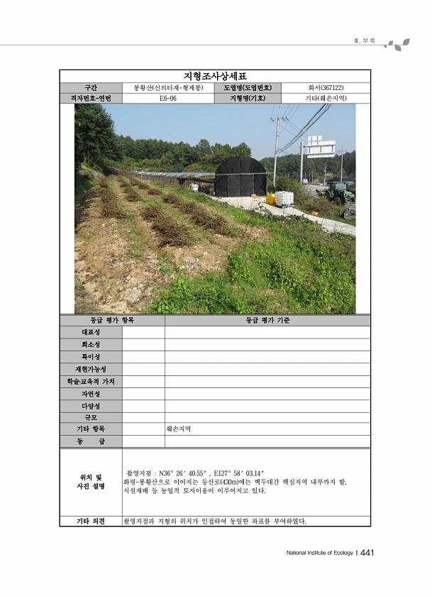 Ⅲ. 부 록 National Institute of EcologyⅠ441 지형조사상세표 구간 봉황산 신의터재-형제봉 도엽명 도엽번호 화서 367122 격자번호-연번 E6-06 지형명 기호 기타 훼손지역 등급 평가 항목 등급 평가 기준 대표성 희소성 특이성 재현가능성 학술?교육적 가치 자연성 다양성 규모 기타 항목 훼손지역 등 급 위치 및 사진 설명 촬영지점 N36° 26′ 40.55″ , E127° 58′ 03.14″ 화령-봉황산으로 이어지는 등산로 430m 에는 백두대간 핵심지역 내부까지 밭, 시설재배 등 농업적 토지이용이 이루어지고 있다. 기타 의견 촬영지점과 지형의 위치가 인접하여 동일한 좌표를부여하였다.