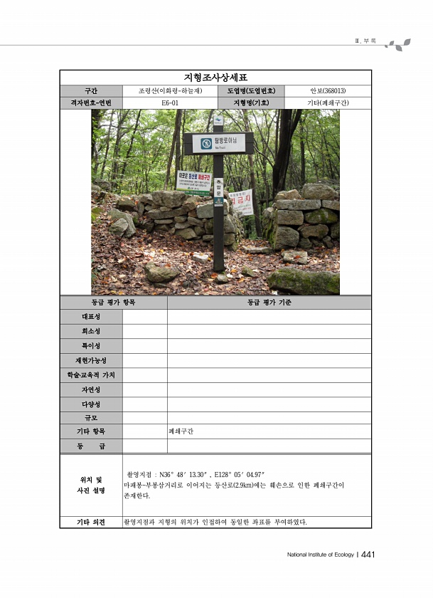 Ⅲ. 부 록 National Institute of EcologyⅠ441 지형조사상세표 구간 조령산 이화령-하늘재 도엽명 도엽번호 안보 368013 격자번호-연번 E6-01 지형명 기호 기타 폐쇄구간 등급 평가 항목 등급 평가 기준 대표성 희소성 특이성 재현가능성 학술?교육적 가치 자연성 다양성 규모 기타 항목 폐쇄구간 등 급 위치 및 사진 설명 촬영지점 N36° 48′ 13.30″ , E128° 05′ 04.97″ 마패봉부봉삼거리로 이어지는 등산로 2.9km 에는 훼손으로 인한 폐쇄구간이 존재한다. 기타 의견 촬영지점과 지형의 위치가 인접하여 동일한 좌표를부여하였다.