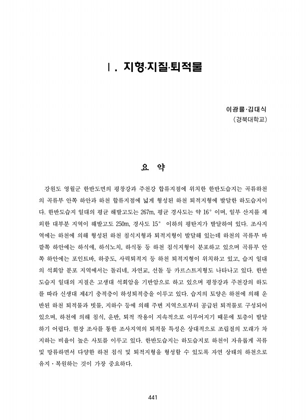 441 Ⅰ. 지형?지질?퇴적물 이광률·김대식 경북대학교 요 약 강원도 영월군 한반도면의 평창강과 주천강 합류지점에 위치한 한반도습지는 곡류하천 의 곡류부 안쪽 하안과 하천 합류지점에 넓게 형성된 하천 퇴적지형에 발달한 하도습지이 다. 한반도습지 일대의 평균 해발고도는 267m, 평균 경사도는 약 16°이며, 일부 산지를 제 외한 대부분 지역이 해발고도 250m, 경사도 15° 이하의 평탄지가 발달하여 있다. 조사지 역에는 하천에 의해 형성된 하천 침식지형과 퇴적지형이 발달해 있는데 하천의 곡류부 바 깥쪽 하안에는 하식애, 하식노치, 하식동 등 하천 침식지형이 분포하고 있으며 곡류부 안 쪽 하안에는 포인트바, 하중도, 사력퇴적지 등 하천 퇴적지형이 위치하고 있고, 습지 일대 의 석회암 분포 지역에서는 돌리네,...
