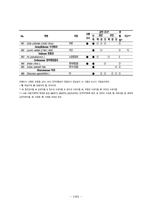1191 선행조사나혜련, 유광필. 2015. 2015 전국내륙습지 정밀조사침실습지, IV. 식물상 보고서. 국립습지센터. *핵. 핵심지역, 완. 완충지역, 전. 전이지역. **D. 중건성식물, H. 습생식물, E. 정수성 수생식물, S. 침수성 수생식물, FL. 부엽성 수생식물, FF. 부유성 수생식물. ***IIV. 식물구계학적 특정종 등급, EN 위기 ; VU 취약 ; LC 관심대상 한국적색목록 범주, 고. 한반도 고유종, 귀. 귀화식물, 교. 생태계 교란야생식물, 식식재종, 야. 식재종 야생상 분포. No. 학명 국명 선행 조사 금번 조사* 생 활 형 ** 전 비고*** 체 좌안 우안 핵 완 전 핵 완 전 481 Scilla scilloides Lindl. Druce 무릇 ● ● O O O D Amar...