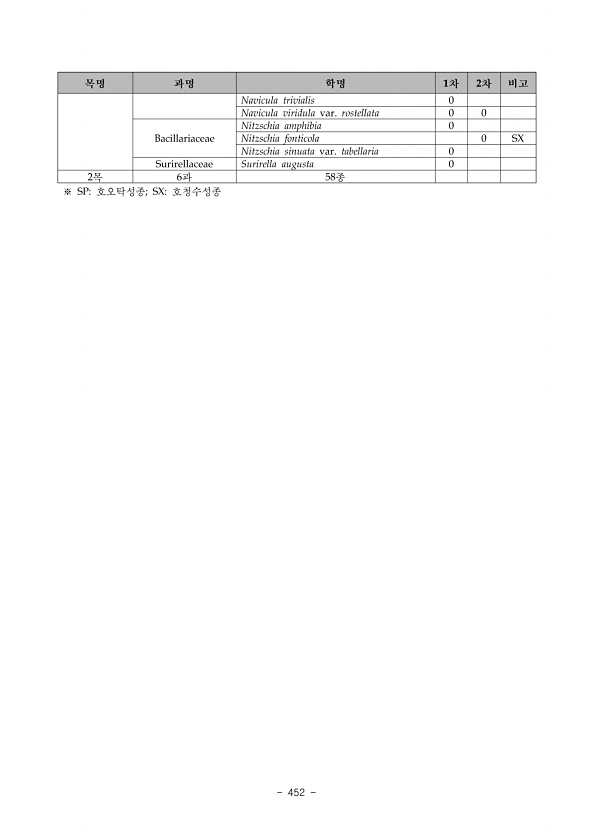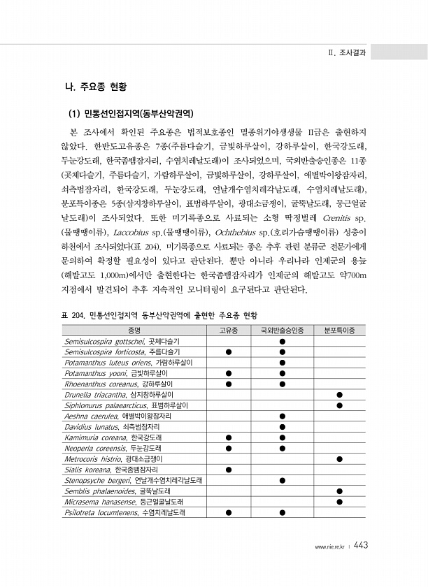 Ⅱ. 조사결과 www.nie.re.kr ? 443 나. 주요종 현황 1 민통선인접지역 동부산악권역 본 조사에서 확인된 주요종은 법적보호종인 멸종위기야생생물 II급은 출현하지 않았다. 한반도고유종은 7종 주름다슬기, 금빛하루살이, 강하루살이, 한국강도래, 두눈강도래, 한국좀뱀잠자리, 수염치레날도래 이 조사되었으며, 국외반출승인종은 11종 곳체다슬기, 주름다슬기, 가람하루살이, 금빛하루살이, 강하루살이, 애별박이왕잠자리, 쇠측범잠자리, 한국강도래, 두눈강도래, 연날개수염치레각날도래, 수염치레날도래 , 분포특이종은 5종 삼지창하루살이, 표범하루살이, 광대소금쟁이, 굴뚝날도래, 둥근얼굴 날도래 이 조사되었다. 또한 미기록종으로 사료되는 소형 딱정벌레 Crenitis sp. 물땡땡이류 , Laccobius sp. 물...