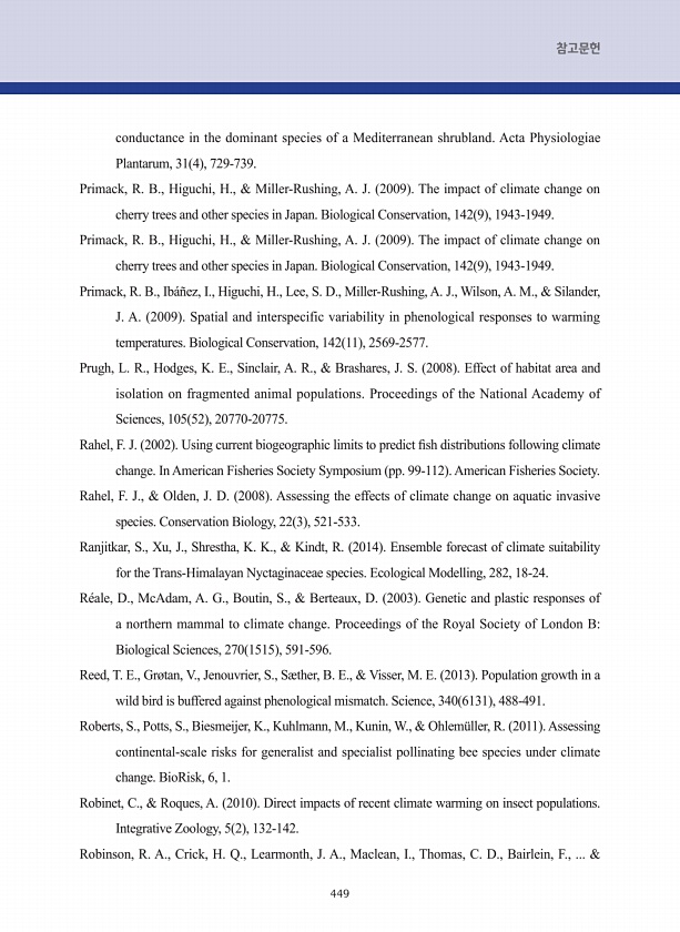 449 참고문헌 conductance in the dominant species of a Mediterranean shrubland. Acta Physiologiae Plantarum, 31 4 , 729-739. Primack, R. B., Higuchi, H., & Miller-Rushing, A. J. 2009 The impact of climate change on cherry trees and other species in Japan. Biological Conservation, 142 9 , 1943-1949. Primack, R. B., Higuchi, H., & Miller-Rushing, A. J. 2009 The impact of climate change on cherry trees an...