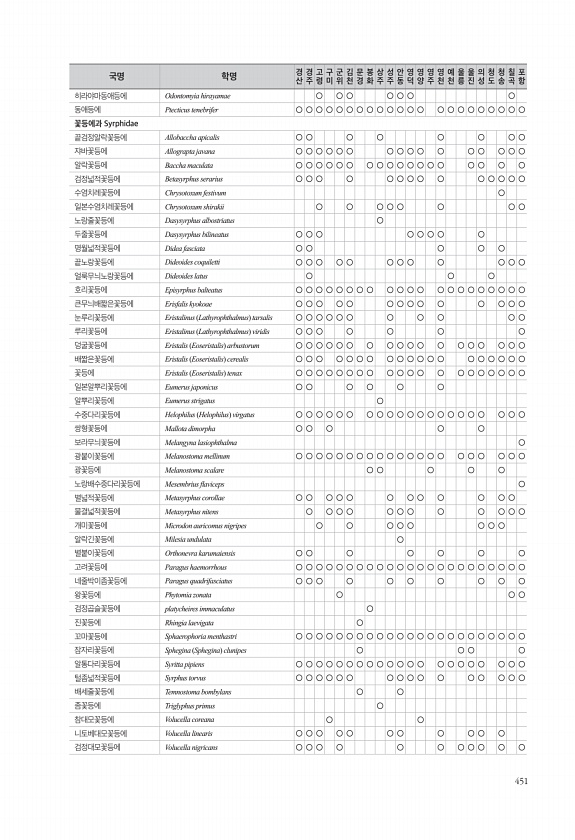 451 히라야마동애등에 Odontomyia hirayamae ○ ○ ○ ○ ○ ○ ○ 동애등에 Ptecticus tenebrifer ○ ○ ○ ○ ○ ○ ○ ○ ○ ○ ○ ○ ○ ○ ○ ○ ○ ○ ○ ○ ○ ○ 꽃등에과 Syrphidae 끝검정알락꽃등에 Allobaccha apicalis ○ ○ ○ ○ ○ ○ ○ ○ 쟈바꽃등에 Allograpta javana ○ ○ ○ ○ ○ ○ ○ ○ ○ ○ ○ ○ ○ ○ ○ ○ 알락꽃등에 Baccha maculata ○ ○ ○ ○ ○ ○ ○ ○ ○ ○ ○ ○ ○ ○ ○ ○ ○ ○ 검정넓적꽃등에 Betasyrphus serarius ○ ○ ○ ○ ○ ○ ○ ○ ○ ○ ○ ○ ○ ○ 수염치레꽃등에 Chrysotoxum festivum ○ 일본수염치레꽃등에 Chrysotoxu...