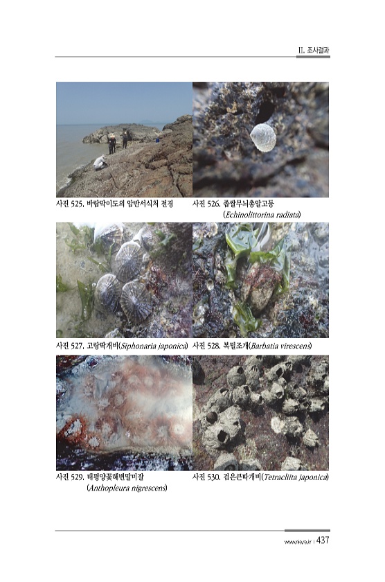 II. 조사결과 www.nie.re.kr ?437 사진 525. 바람막이도의 암반서식처 전경 사진 526. 좁쌀무늬총알고둥 Echinolittorina radiata 사진 527. 고랑딱개비 Siphonaria japonica 사진 528. 복털조개 Barbatia virescens 사진 529. 태평양꽃해변말미잘 Anthopleura nigrescens 사진 530. 검은큰따개비 Tetracliita japonica
