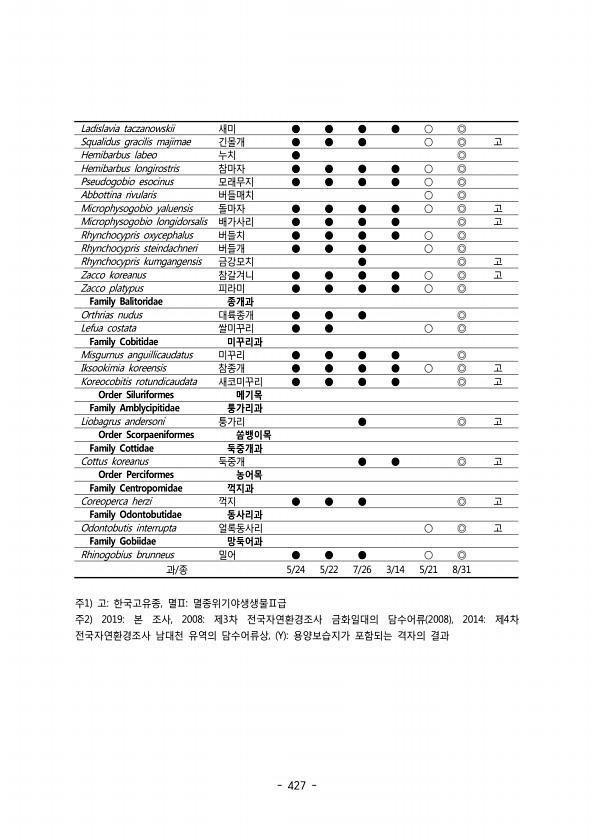 427 Ladislavia taczanowskii 새미 ● ● ● ● ○ ◎ Squalidus gracilis majimae 긴몰개 ● ● ● ○ ◎ 고 Hemibarbus labeo 누치 ● ◎ Hemibarbus longirostris 참마자 ● ● ● ● ○ ◎ Pseudogobio esocinus 모래무지 ● ● ● ● ○ ◎ Abbottina rivularis 버들매치 ○ ◎ Microphysogobio yaluensis 돌마자 ● ● ● ● ○ ◎ 고 Microphysogobio longidorsalis 배가사리 ● ● ● ● ◎ 고 Rhynchocypris oxycephalus 버들치 ● ● ● ● ○ ◎ Rhynchocypris steindachneri 버들개 ● ● ● ○ ◎ Rhynchoc...