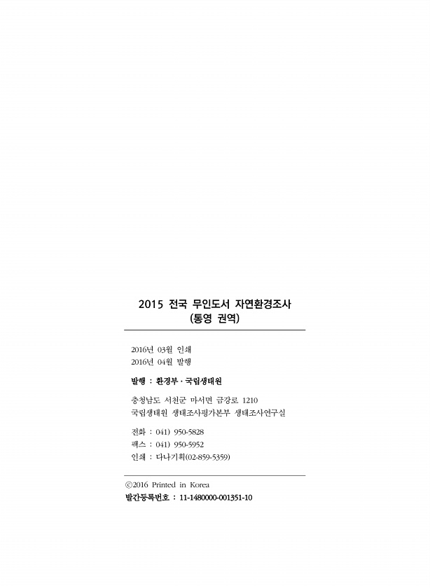 2015 전국 무인도서 자연환경조사 통영 권역 2016년 03월 인쇄 2016년 04월 발행 발행 환경부·국립생태원 충청남도 서천군 마서면 금강로 1210 국립생태원 생태조사평가본부 생태조사연구실 전화 041 950-5828 팩스 041 950-5952 인쇄 다나기획 02-859-5359 ⓒ2016 Printed in Korea 발간등록번호 11-1480000-001351-10