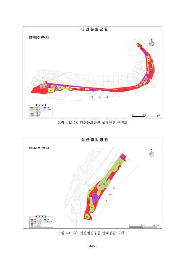 vi. 양서·파충류 www.nie.re.kr ?443 6구간 ? 오천습지 다른 구간에 비해 상대적으로 짧은 구간이다. 하천 주변은 산지와 인접하여 농경지가 있으도 면 적이 매우 좁으나 일부 구간에서는 농경지를 늘리기 위해 서식지 변형이 일어나고 있기도 하다. 7구간 ? 경진습지 비교적 규모가 큰 하천들이 합류하는 구간으로 합류부 중심으로 농경지가 잘 발달해 있다. 구간 은 매우 길지만 구조 자체는 일정하여 비교적 단순하다. 지류 합류부를 중심으로 계절에 따라 습 지가 형성되기도한다.