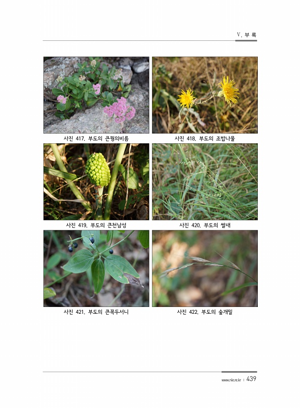 Ⅴ. 부 록 www.nie.re.kr ? 439 사진 417. 부도의 큰꿩의비름 사진 418. 부도의 조밥나물 사진 419. 부도의 큰천남성 사진 420. 부도의 쌀새 사진 421. 부도의 큰꼭두서니 사진 422. 부도의숲개밀