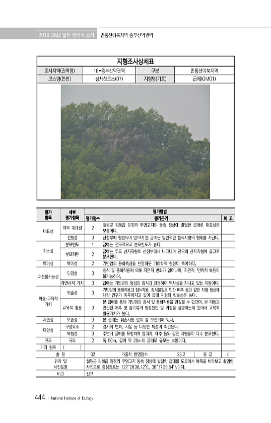 2018 DMZ 일원 생태계 조사 민통선이북지역 중부산악권역 444 ? National Institute of Ecology 지형조사상세표 조사지역 권역명 18-중부산악권역 구분 민통선이북지역 코스명 연번 성재산코스 07 지형명 기호 급애 GM01 평가 항목 세부 평가항목 평가방법 평가점수 평가근거 비 고 대표성 지역 대표성 2 철원군 김화읍 암정리 무명고지의 동측 정상에 발달한 급애로 대표성은 보통이다. 전형성 3 산정부에 형성되어 있으며 본 급애는 일반적인 침식지형의 형태를 지닌다. 희소성 분포빈도 1 급애는 전국적으로 분포빈도가 높다. 분포패턴 2 급애는 주로 산지지형의 산정부에서 나타나며 전국의 산지지형에 골고루 분포한다. 특이성 특이성 2 기반암의 풍화특성을 반영하듯 기하학적 형상이 특이하다. 재현...