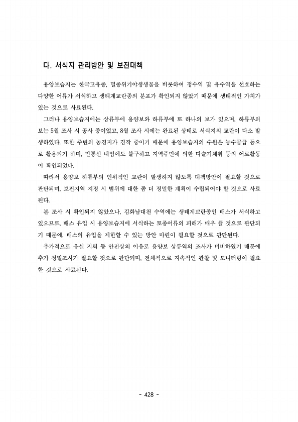 428 용양보습지는 한국고유종 멸종위기야생생물을 비롯하여 정수역 및 유수역을 선호하는 , 다양한 어류가 서식하고 생태계교란종의 분포가 확인되지 않았기 때문에 생태적인 가치가 있는 것으로 사료된다. 그러나 용양보습지에는 상류부에 용양보와 하류부에 또 하나의 보가 있으며 하류부의, 보는 월 조사 시 공사 중이었고 월 조사 시에는 완료된 상태로 서식지의 교란이 다소 발 5 , 8 생하였다 또한 주변의 농경지가 경작 중이기 때문에 용양보습지의 수원은 농수공급 등으 로 활용되기 하며 민통선 내임에도 불구하고 지역주민에 의한 다슬기채취 등의 어로활동 , 이 확인되었다. 따라서 용양보 하류부의 인위적인 교란이 발생하지 않도록 대책방안이 필요할 것으로 판단되며 보전지역 지정 시 범위에 대한 좀 더 정밀한 계획이 수립되어야...