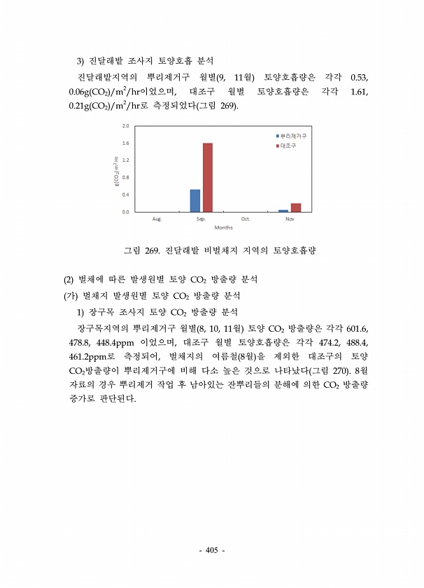 405 3 진달래밭 조사지 토양호흡 분석 진달래밭지역의 뿌리제거구 월별 9, 11월 토양호흡량은 각각 0.53, 0.06g CO2 /m2/hr이었으며, 대조구 월별 토양호흡량은 각각 1.61, 0.21g CO2 /m2/hr로 측정되었다 그림 269 그림 269. 진달래밭 비벌채지 지역의 토양호흡량 2 벌채에 따른 발생원별 토양 CO2 방출량 분석 가 벌채지 발생원별 토양 CO2 방출량 분석 1 장구목 조사지 토양 CO2 방출량 분석 장구목지역의 뿌리제거구 월별 8, 10, 11월 토양 CO2 방출량은 각각 601.6, 478.8, 448.4ppm 이었으며, 대조구 월별 토양호흡량은 각각 474.2, 488.4, 461.2ppm로 측정되어, 벌채지의 여름철 8월 을 제외한 대조구의 토양 CO2방출량이 뿌리제거...