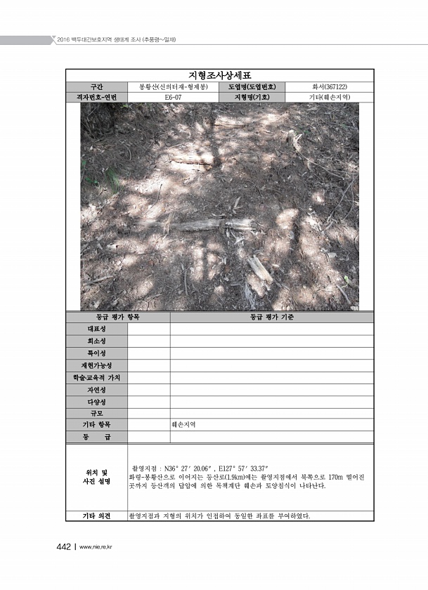2016 백두대간보호지역 생태계 조사 추풍령밀재 442Ⅰwww.nie.re.kr 지형조사상세표 구간 봉황산 신의터재-형제봉 도엽명 도엽번호 화서 367122 격자번호-연번 E6-07 지형명 기호 기타 훼손지역 등급 평가 항목 등급 평가 기준 대표성 희소성 특이성 재현가능성 학술?교육적 가치 자연성 다양성 규모 기타 항목 훼손지역 등 급 위치 및 사진 설명 촬영지점 N36° 27′ 20.06″ , E127° 57′ 33.37″ 화령-봉황산으로 이어지는 등산로 1.9km 에는 촬영지점에서 북쪽으로 170m 떨어진 곳까지 등산객의 답압에 의한 목책계단 훼손과 토양침식이 나타난다. 기타 의견 촬영지점과 지형의 위치가 인접하여 동일한 좌표를부여하였다.
