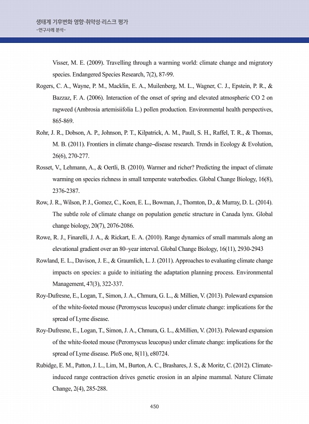 450 생태계 기후변화 영향·취약성·리스크 평가 -연구사례 분석- Visser, M. E. 2009 Travelling through a warming worldclimate change and migratory species. Endangered Species Research, 7 2 , 87-99. Rogers, C. A., Wayne, P. M., Macklin, E. A., Muilenberg, M. L., Wagner, C. J., Epstein, P. R., & Bazzaz, F. A. 2006 Interaction of the onset of spring and elevated atmospheric CO 2 on ragweed Ambrosia artemisiifolia L. pollen prod...