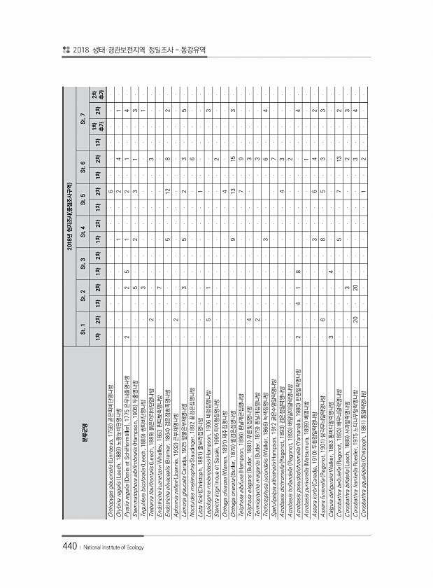 440 분류군명 2018년 현지조사 중점조사구역 St. 1 St. 2 St. 3 St. 4 St. 5 St. 6 St. 7 1차 2차 1차 2차 1차 2차 1차 2차 1차 2차 1차 2차 1차 1차 추가 2차 추가 2차 Orthopygia glaucinalis Linnaeus, 1758 곧은띠비단명나방 6 Orybina regalis Leech, 1889 노랑눈비단명나방 1 2 4 1 Pyralis regalis [Denis et Schifferm?ller], 1775 은무늬줄명나방 2 2 5 1 2 1 4 Stemmatophora albifimbrialis Hampson, 1906 ...