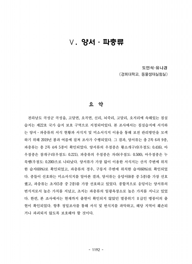 1192 Ⅴ. 양서·파충류 도민석·유나경 경희대학교, 동물생태실험실 요 약 전라남도 곡성군 곡성읍, 고달면, 오곡면, 신리, 뇌죽리, 고달리, 오지리에 속해있는 침실 습지는 제22호 국가 습지 보호 구역으로 지정되어있다. 본 조사에서는 침실습지에 서식하 는 양서·파충류의 서식 현황과 서식지 및 미소서식지 이용을 통해 보전 관리방안을 모색 하기 위해 2019년 봄과 여름에 걸쳐 조사가 수행되었다. 그 결과, 양서류는 총 2목 6과 9종, 파충류는 총 2목 4과 5종이 확인되었다. 양서류의 우점종은 황소개구리 우점도0.416 , 아 우점종은 참개구리 우점도0.221 , 파충류의 우점종은 자라 우점도0.500 , 아우점종은 누 룩뱀 우점도0.200 으로 나타났다. 양서류가 가장 많이 이용한 서식지는 산지 주변에 ...