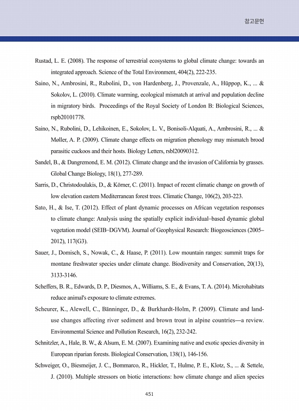 451 참고문헌 Rustad, L. E. 2008 The response of terrestrial ecosystems to global climate changetowards an integrated approach. Science of the Total Environment, 404 2 , 222-235. Saino, N., Ambrosini, R., Rubolini, D., von Hardenberg, J., Provenzale, A., H?ppop, K., ... & Sokolov, L. 2010 Climate warming, ecological mismatch at arrival and population decline in migratory birds. Proceedings of the Royal...