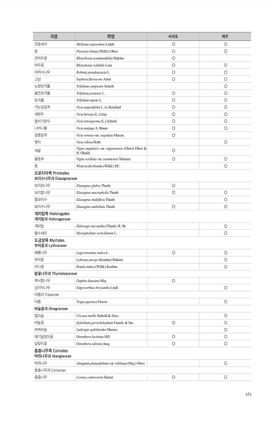 451 전동싸리 Melilotus suaveolens Ledeb. ○ ○ 칡 Pueraria lobata Willd. Ohwi ○ ○ 큰여우콩 Rhynchosia acuminatifolia Makino ○ 여우콩 Rhynchosia volubilis Lour. ○ ○ 아까시나무 Robinia pseudoacacia L. ○ ○ 고삼 Sophora favescens Aiton ○ ○ 노랑토끼풀 Trifolium campestre Schreb. ○ 붉은토끼풀 Trifolium pratense L. ○ ○ 토끼풀 Trifolium repens L. ○ ○ 가는살갈퀴 Vicia angustifolia L. ex Reichard ○ ○ 새완두 Vicia hirsuta L. Gray ○ ○ 얼치기완두 Vicia tet...