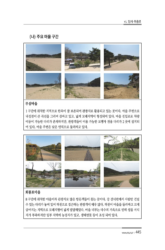 vi. 양서·파충류 www.nie.re.kr ?445 무섬마을 1 구간에 위치한 지역으로 한옥이 잘 보존되어 관광지로 활용되고 있는 곳이다. 마을 주변으로 내성천이 큰 곡선을 그리며 감싸고 있고, 넓게 모래지역이 형성되어 있다. 마을 진입로로 차량 이동이 가능한 다리가 존재하지만, 관광객들이 이용 가능한 보행자 전용 다리가 2 곳에 설치되 어 있다. 마을 주변은 낮은 언덕으로 둘러싸고 있다. 회룡포마을 8 구간에 위치한 마을이자 관광지로 많은 방문객들이 찾는 곳이다. 강 건너편에서 사람만 건널 수 있는 다리가 놓여 있어 하천으로 접근하는 관광객이 매우 많다. 하천이 마을을 둘러싸고 크게 굽어지는 지역으로 모래지형이 넓게 발달해있다. 마을 내부는 다수의 가옥으로 인해 생물 서식 지가 부족하지만 일부 지역에 농...