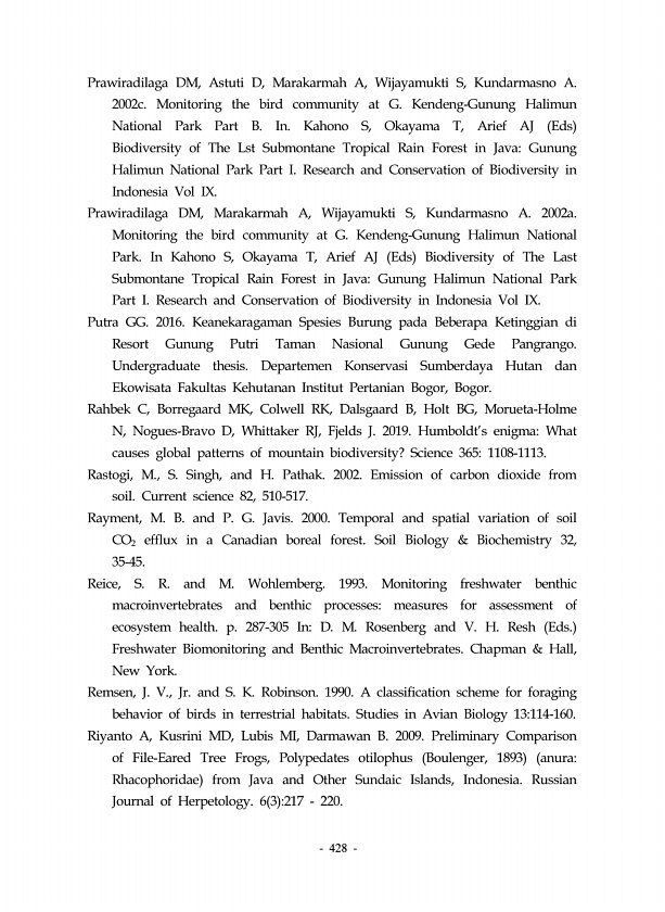 428 Prawiradilaga DM, Astuti D, Marakarmah A, Wijayamukti S, Kundarmasno A. 2002c. Monitoring the bird community at G. Kendeng-Gunung Halimun National Park Part B. In. Kahono S, Okayama T, Arief AJ Eds Biodiversity of The Lst Submontane Tropical Rain Forest in JavaGunung Halimun National Park Part I. Research and Conservation of Biodiversity in Indonesia Vol IX. Prawiradilaga DM, Marakarmah A, Wij...