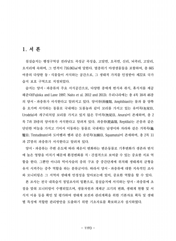 1193 1. 서 론 침실습지는 행정구역상 전라남도 곡성군 곡성읍, 고달면, 오곡면, 신리, 뇌죽리, 고달리, 오지리에 속하며, 그 면적이 716.063㎡에 달한다. 멸종위기 야생생물들을 포함하여, 총 665 여종의 다양한 동·식물들이 서식하는 공간으로, 그 생태적 가치를 인정받아 제22호 국가 습지 보호 구역으로 지정되었다. 습지는 양서·파충류의 주요 서식공간으로, 다양한 종에게 번식과 취식, 휴식지를 제공 해준다 Fujioka and Lane 1997; Naito et al. 2012 and 2013 우리나라에는 총 4목 18과 46종 의 양서·파충류가 서식한다고 알려지고 있다. 양서류 兩棲類, Amphibian 는 물과 뭍 양쪽 을 오가며 서식하는 동물로 국내에는 도롱뇽과 같이 꼬리를 가지고 있는 유미...