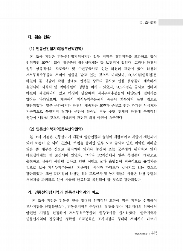Ⅱ. 조사결과 www.nie.re.kr ? 445 다. 훼손 현황 1 민통선인접지역 동부산악권역 본 조사 지점은 민통선인접지역이지만 일부 지역은 위험지역을 포함하고 있어 인위적인 교란이 없어 대부분의 하천생태계는 잘 보전되어 있었다. 그러나 하천의 일부 상류에서의 도로공사 및 수변부공사로 인한 하천의 교란이 있어 하천의 저서무척추동물의 서식에 영향을 받고 있는 것으로 나타났다. St.2지점 인북천 은 하천의 물 색깔이 탁한 상태로 인북천 상류의 공사로 인한 흙탕물이 계속해서 유입되어 서식처 및 먹이자원에 영향을 미치고 있었다. St.5지점은 공사로 인하여 하천이 채널화되어 있고 하상이 단순하여 저서무척추동물의 다양도가 떨어지는 양상을 나타냈으며, 계속해서 저서무척추동물의 종들이 회복되지 못할 것으로 판단되었...