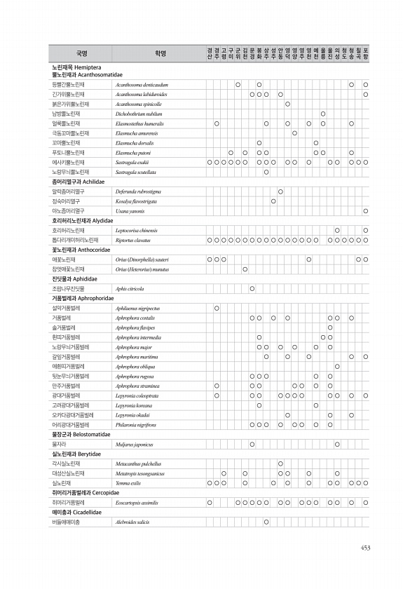 453 노린재목 Hemiptera 뿔노린재과 Acanthosomatidae 등빨간뿔노린재 Acanthosoma denticaudum ○ ○ ○ ○ 긴가위뿔노린재 Acanthosoma labiduroides ○ ○ ○ ○ ○ 붉은가위뿔노린재 Acanthosoma spinicolle ○ 남방뿔노린재 Dichobothrium nubilum ○ 얼룩뿔노린재 Elasmostethus humeralis ○ ○ ○ ○ ○ ○ 극동꼬마뿔노린재 Elasmucha amurensis ○ 꼬마뿔노린재 Elasmucha dorsalis ○ ○ 푸토니뿔노린재 Elasmucha putoni ○ ○ ○ ○ ○ ○ ○ 에사키뿔노린재 Sastragala esakii ○ ○ ○ ○ ○ ○ ○ ○ ○ ○ ○ ○ ○ ○ ○ ○ ○ 노랑무늬뿔노린...