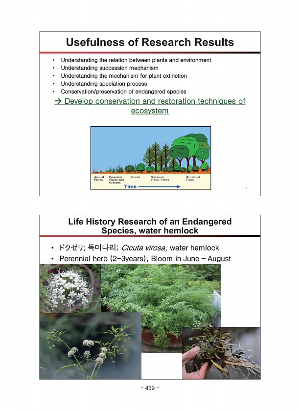 ? ドクゼリ; 독미나리; Cicuta virosa, water hemlock ? Perennial herb 2-3years , Bloom in June ? August 8 Life History Research of an Endangered Species, water hemlock Usefulness of Research Results ? Understanding the relation between plants and environment ? Understanding succession mechanism ? Understanding the mechanism for plant extinction ? Understanding speciation process ? Conservation/preservation ...
