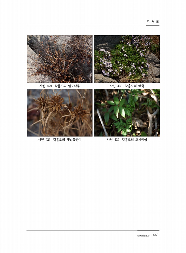 Ⅴ. 부 록 www.nie.re.kr ? 441 사진 429. 각흘도의 앵도나무 사진 430. 각흘도의 해국 사진 431. 각흘도의 갯방동산이 사진 432. 각흘도의고사리삼