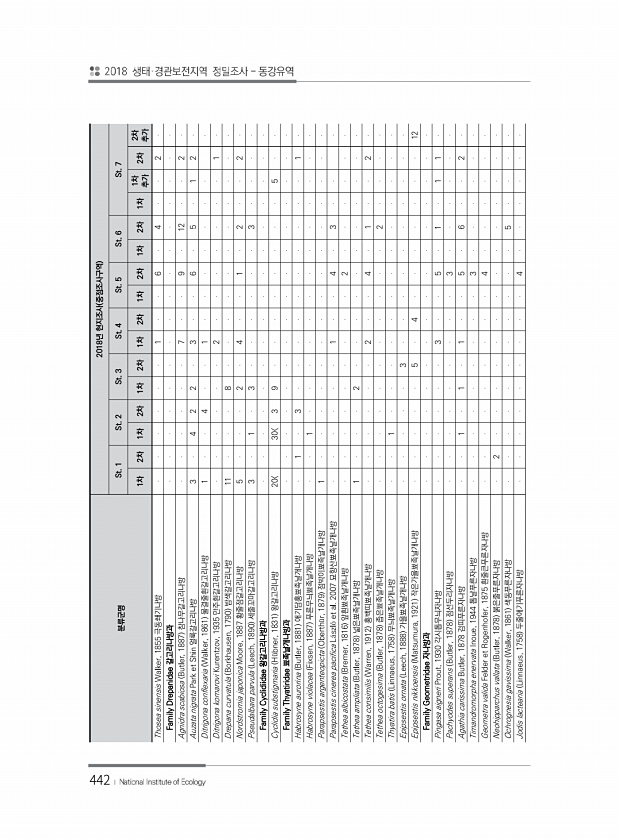 442 분류군명 2018년 현지조사 중점조사구역 St. 1 St. 2 St. 3 St. 4 St. 5 St. 6 St. 7 1차 2차 1차 2차 1차 2차 1차 2차 1차 2차 1차 2차 1차 1차 추가 2차 추가 2차 Thosea sinensis Walker, 1855 극동쐐기나방 1 6 4 2 Family Drepanidae 갈고리나방과 Agnidra scabiosa Butler, 1887 참나무갈고리나방 7 9 12 2 Auzata nigrata Park et Shin 얼룩갈고리나방 3 4 2 2 3 6 5 1 2 Ditrigona conflexaria Walker, 1861 물결줄흰갈고리나방...