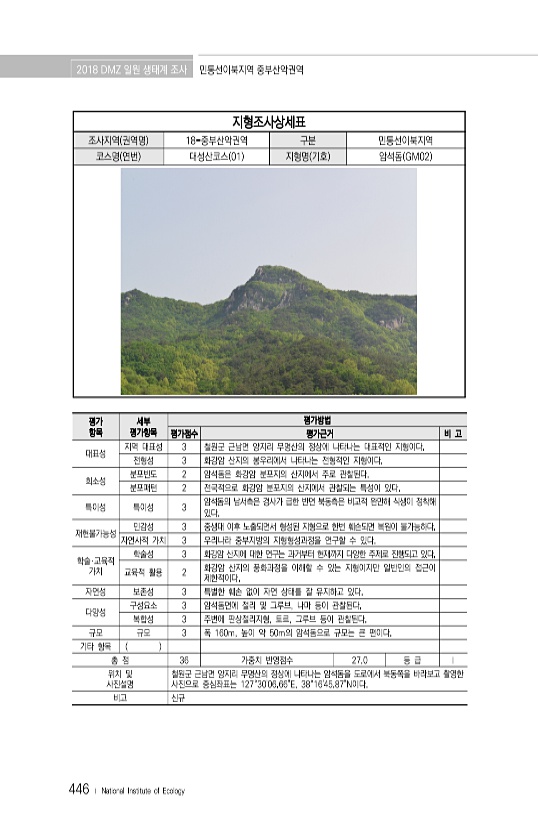 2018 DMZ 일원 생태계 조사 민통선이북지역 중부산악권역 446 ? National Institute of Ecology 지형조사상세표 조사지역 권역명 18-중부산악권역 구분 민통선이북지역 코스명 연번 대성산코스 01 지형명 기호 암석돔 GM02 평가 항목 세부 평가항목 평가방법 평가점수 평가근거 비 고 대표성 지역 대표성 3 철원군 근남면 양지리 무명산의 정상에 나타나는 대표적인 지형이다. 전형성 3 화강암 산지의 봉우리에서 나타나는 전형적인 지형이다. 희소성 분포빈도 2 암석돔은 화강암 분포지의 산지에서 주로 관찰된다. 분포패턴 2 전국적으로 화강암 분포지의 산지에서 관찰되는 특성이 있다. 특이성 특이성 3 암석돔의 남서측은 경사가 급한 반면 북동측은 비교적 완만해 식생이 정착해 있다. 재현불가능성 ...