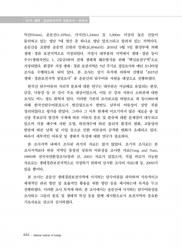 2015 생태·경관보전지역 정밀조사 운문산 444 ? National Institute of Ecology 억산 944m , 운문산 1,195m , 가지산 1,240m 등 1,000m 이상의 높은 산들이 둘러싸고 있는 영남 7대 명산 중 하나로 영남 알프스라고 알려져 있는 지역이다. 운문산을 포함한 운문면 신원리 일대 26,394㎢ 는 2010년 9월 9일 환경부에 의해 생태·경관 보전지역으로 지정되었다. 지정시 대부분의 지역에서 생태·경관 등이 우수 생태자연도 1, 2등급 하여 전체 생태계 훼손방지를 위해 “핵심보전구역”으로 지정되었다. 환경부 지정 생태·경관 보전지역은 5년 주기로 정밀조사와 매년 모니터링 조사을 수행하도록 되어 있다. 본 조사는 상기 목적에 의하여 진행된 “2015년 생태·경관보전지역 ...