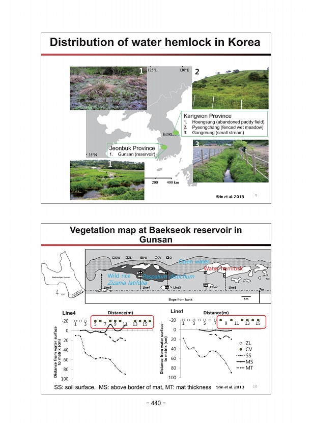 Vegetation map at Baekseok reservoir in Gunsan -20 0 20 40 60 80 100 1 3 5 7 9 11 13 15 Distance from water surface to matrix cm ZL CV SS MS MT -20 0 20 40 60 80 100 1 3 5 7 9 11 13 15 Distance from water surface to matrix cm Line4 Distance m Line1 Distance m SSsoil surface, MSabove border of mat, MTmat thickness Shin et al. 2013 Wild rice Zizania latifolia Open water Water hemlock Paspalum distic...