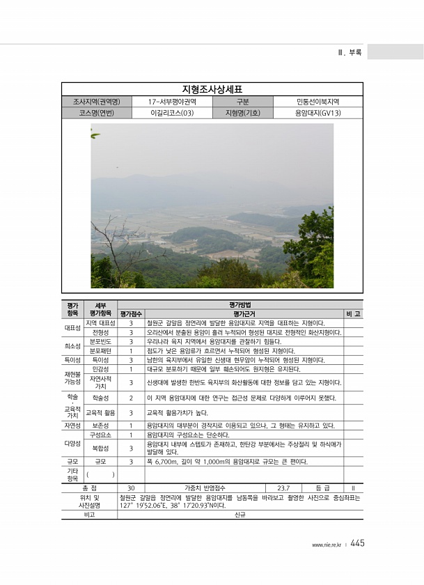 Ⅲ. 부록 www.nie.re.kr ? 445 지형조사상세표 조사지역 권역명 17-서부평야권역 구분 민통선이북지역 코스명 연번 이길리코스 03 지형명 기호 용암대지 GV13 평가 항목 세부 평가항목 평가방법 평가점수 평가근거 비 고 대표성 지역 대표성 3 철원군 갈말읍 정연리에 발달한 용암대지로 지역을 대표하는 지형이다. 전형성 3 오리산에서 분출된 용암이 흘러 누적되어 형성된 대지로 전형적인 화산지형이다. 희소성 분포빈도 3 우리나라 육지 지역에서 용암대지를 관찰하기 힘들다. 분포패턴 1 점도가 낮은 용암류가 흐르면서 누적되어 형성된 지형이다. 특이성 특이성 3 남한의 육지부에서 유일한 신생대 현무암이 누적되어 형성된 지형이다. 재현불 가능성 민감성 1 대규모 분포하기 때문에 일부 훼손되어도 원지형은 유지...
