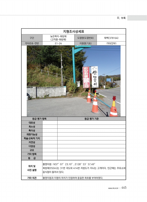 Ⅲ. 부록 www.nie.re.kr ? 445 지형조사상세표 구간 늦은목이화방재 고직령-화방재 도엽명 도엽번호 태백 378164 격자번호-연번 E1-24 지형명 기호 기타 안부 등급 평가 항목 등급 평가 기준 대표성 희소성 특이성 재현가능성 학술?교육적 가치 자연성 다양성 규모 기타 항목 등 급 위치 및 사진 설명 촬영지점 N37°07′23.10″, E128°53′57.49″ 화방재 950m 는 31번 국도와 414번 지방도가 지나는 고개이다. 인근에는 주유소와 음식점이 들어서 있다. 기타 의견 촬영지점과 지형의 위치가 인접하여 동일한 좌표를부여하였다.